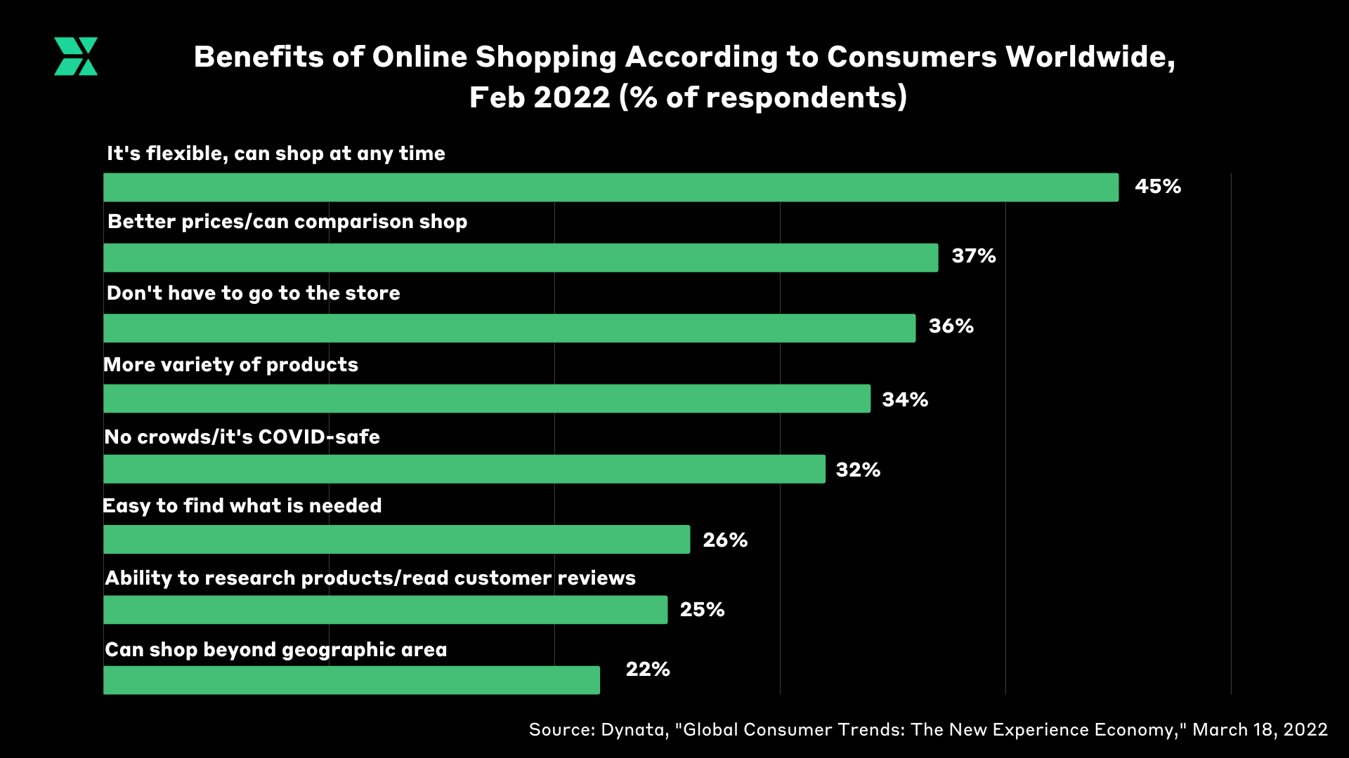 According to Insider Intelligence, retail consumers name flexibility, better prices, and the convenience of not needing to visit a physical store as the top three benefits of online shopping.