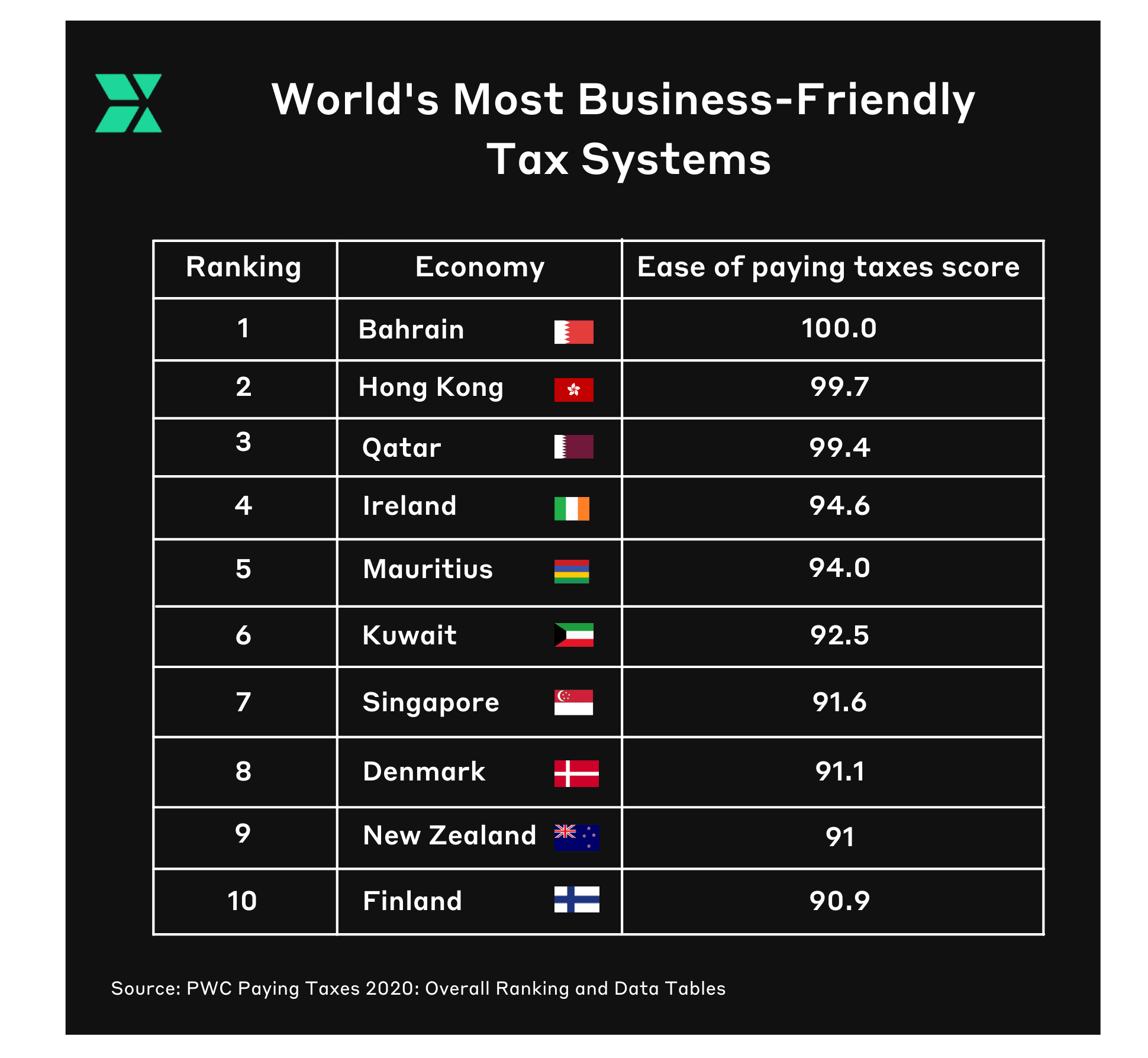 A recent PWC ranking of 190 tax jurisdictions declared Hong Kong the second-most business-friendly tax system in the world after Bahrain and followed by Qatar and Ireland respectively.