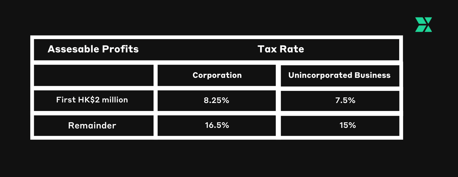 For the first HK$2 million of assessable profits, corporations are charged a tax rate of 8.25%. For all remaining profits, corporations need to pay a statutory 16.5%. Conversely, for unincorporated businesses (i.e. partnerships and sole proprietorships), the two-tiered tax rates are set at 7.5% and 15%.